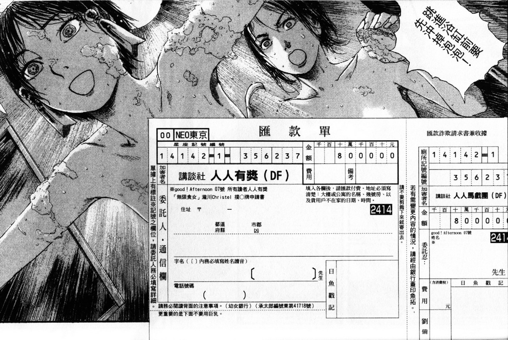 雖然沙村老師也不是沒有畫過搞笑的前例,但為數畢竟不多,回想當年『午安』上刊登過的那篇由湯尼.獄崎老師負責編劇的短篇漫畫「大合作」中,看到《