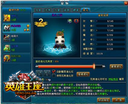 寵物進化共分為1到10級,要進行「寵物進化」前需使用對應等級的「進化石」,將愛寵進化不僅可以使其外型隨著等級不同而變得更加華麗,寵物的資質上限也將隨著等級變化而增長,更會額外得到全新技能格。另外,寵物進化需將「完美度」提升到100%才能夠升級,如果不想要花費太多時間等待進級,玩家也可以利用「完美進化符」來讓寵物直接進化到完美屬性,內外兼具的完美戰寵,就等勇士們搶先來體驗。