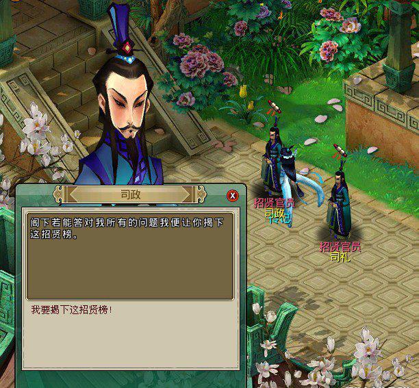 招賢官員司政、司禮在西岐文王府內(西岐341,320),招賢官員將提出15道問題,問題分為5個類別,玩家可根據自己的興趣進行選擇,全部答對招賢官員的15道問題便能揭下招賢榜。