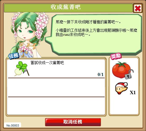 我們的牧場物語》中的任務系統有一特性,即使放棄了原來的任務,其進度也會被保留的。在這條件下,若遇到可同時解決3個不同任務中的課題的情況時,只要把原來進行中的任務暫時放棄,換上有共同要求的任務,這樣便可大大省卻小精靈工作的時間,令牧場更有迅速地成長了!