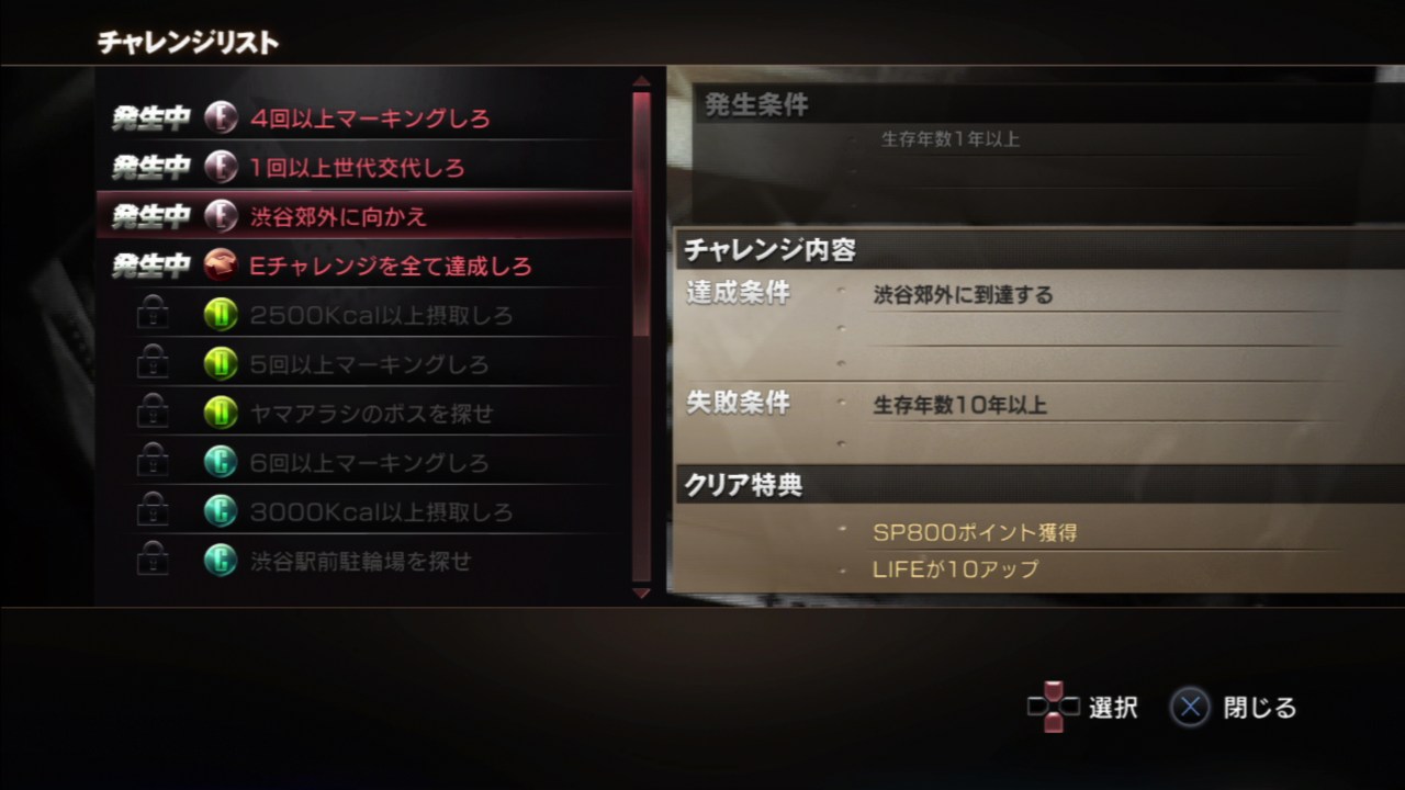 在玩家滿足某種條件下會發生「挑戰」,譬如「完成 1 次以上的世代交替」,或是「前往澀谷郊區」等等,會出現許多挑戰,如果達成挑戰的話就會獲得生存點數做為報酬。當然,最大的目標還是要生存下去,所以,如果挑戰目標較為困難的時候,也有可能放棄。至於要判斷是否該執行挑戰,就要看玩家們了。