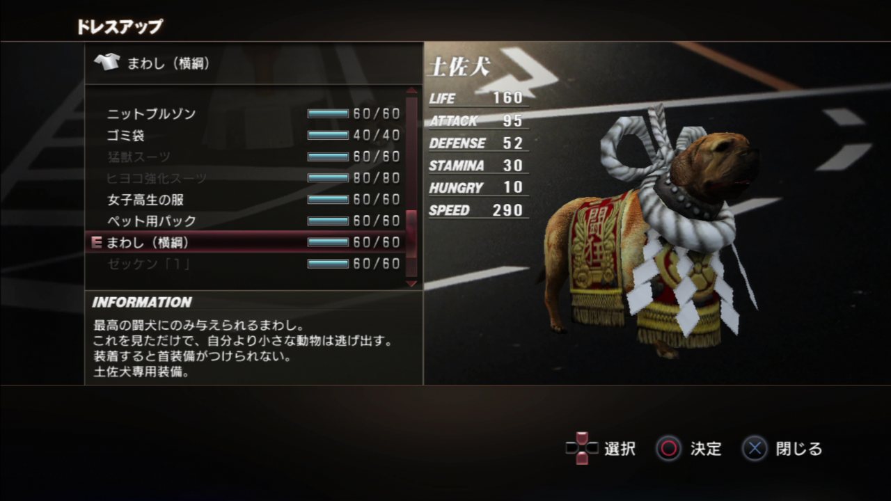橫綱(まわし)」,戴上這個威風凜凜,充滿橫綱風格的專用裝備之後,體格同等以下的動物都會逃走,避免不必要的戰鬥也是很重要的。