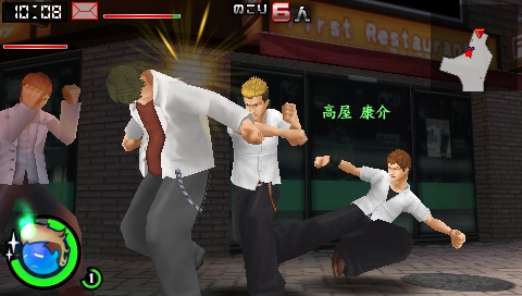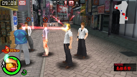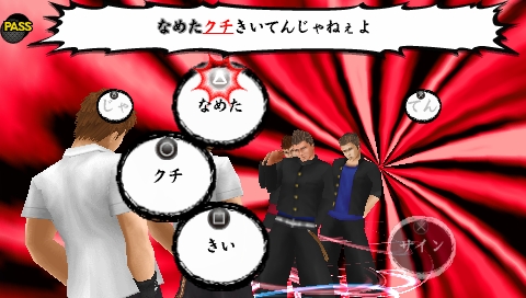 | 按下◯鈕使打架成立的話就會進入叫囂戰鬥。在叫囂戰鬥中,想要叫囂的台詞會分散跑出來,要在時間內按下對應的按鈕,好好的叫囂一番吧! |