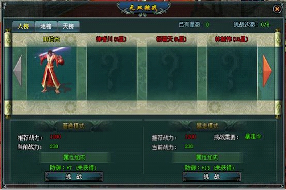 武林高手層出不窮,有好事者將目前武林中喊得上名號的俠客們按能力高低編排等級,劃分為天、地、人三榜。這些榜上有名的大俠也被人視為挑戰的熱門人選,首次戰勝對手將獲得不菲的攻擊、生命、防禦等珍貴永久屬性點加成!更讓人興奮的是,戰勝暴走模式下的各大高手,還會掉落五大門派史詩級裝備!