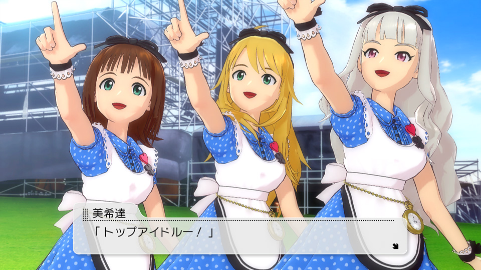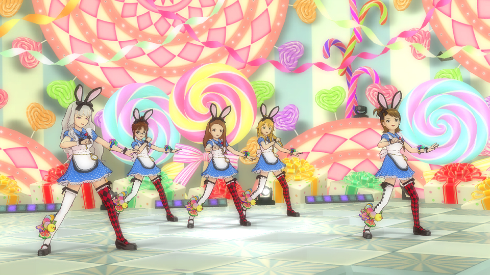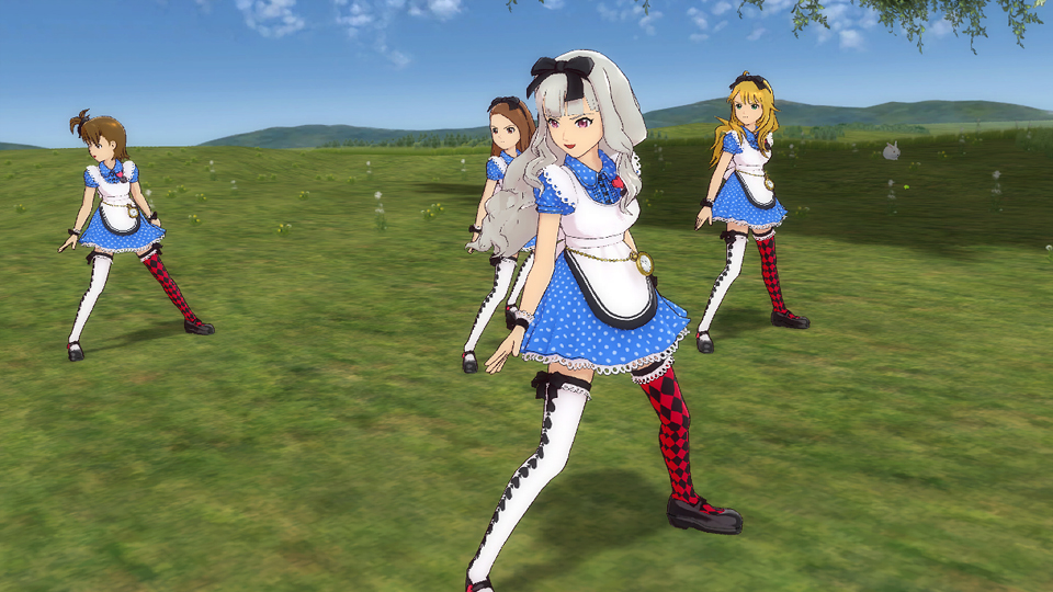 「變裝愛麗絲(ドレッシーアリス)」是以童話愛麗絲夢遊仙境(不思議の国のアリス」為藍本製作的衣裝。腰間放了懷錶以及撲克牌圖樣的絲襪,真的非常有愛麗絲的風格。但是天海春香的絲帶變更成黑色的了,可以說是最值得注目的重點吧?此外變裝愛麗絲可以提高歌唱印象分數。