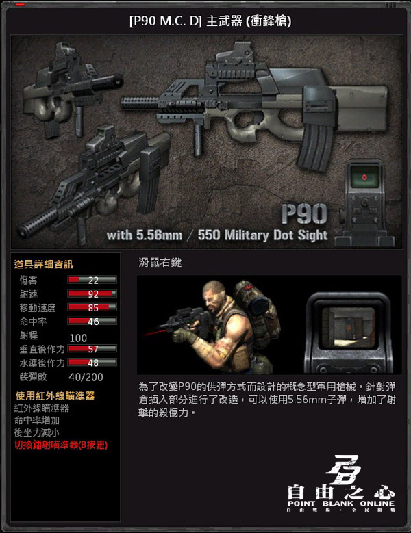 P90 M.C. D:跟一般的P90比起來,更強化了其殺傷力,除了配有紅外線瞄準之外,總彈數亦有所上升。