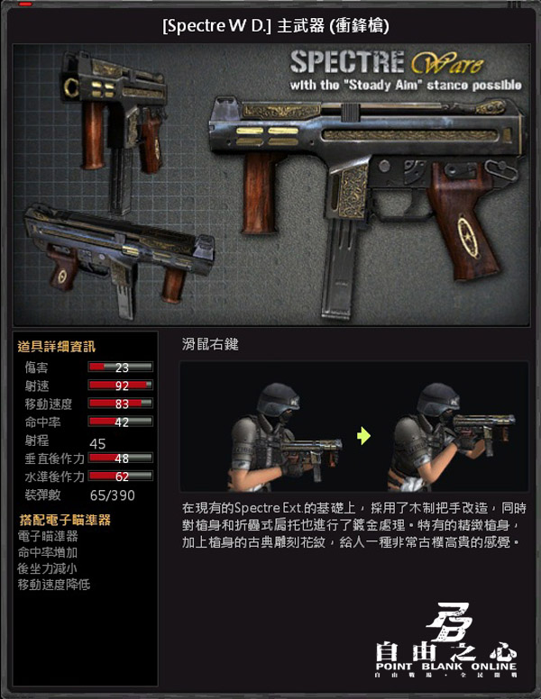 SPECTRE WD:槍身已經過改造,擁有華麗的雕紋,用於殺人、自賞皆相宜,而原本基本款的射速快,容易消耗彈藥,但SPECTRE WD的總彈數整體提升後,改善了容易耗光彈藥的缺點。