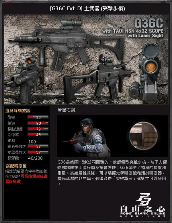 G36C EXT D:與原先基本款的比較之下,其總彈數、命中率皆有上升,槍支本身裝備了光學和雷射瞄準鏡,不僅能用放大倍數的鏡頭來搜尋敵方,更能用雷射做瞄準,無論是縱向或橫向的視野,都能全面性的兼顧並提高命中率!