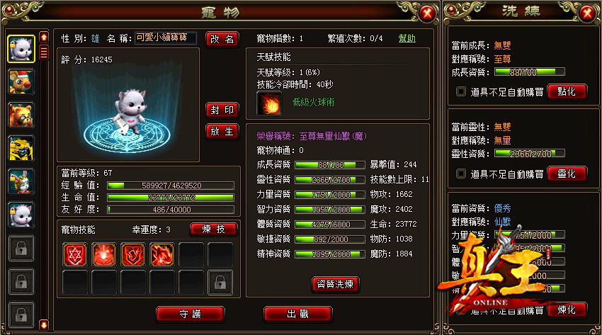 真王》奮勇作戰時不可或缺的忠誠夥伴,就是可愛的寵物們,也讓亂世紛亂的氣息中增添了一些活潑的氣息。玩家達到16級時即可隨機獲得第一隻神寵,神寵們除了能夠訓練技能、洗煉資質,更能夠透過「合體」、「守護」等方式,增加玩家己身的戰鬥力哦。寵物的成長、靈性、資質左右著戰鬥力的高低,玩家可透過道具刷新寵物的素質,獲得更強而有力的夥伴。