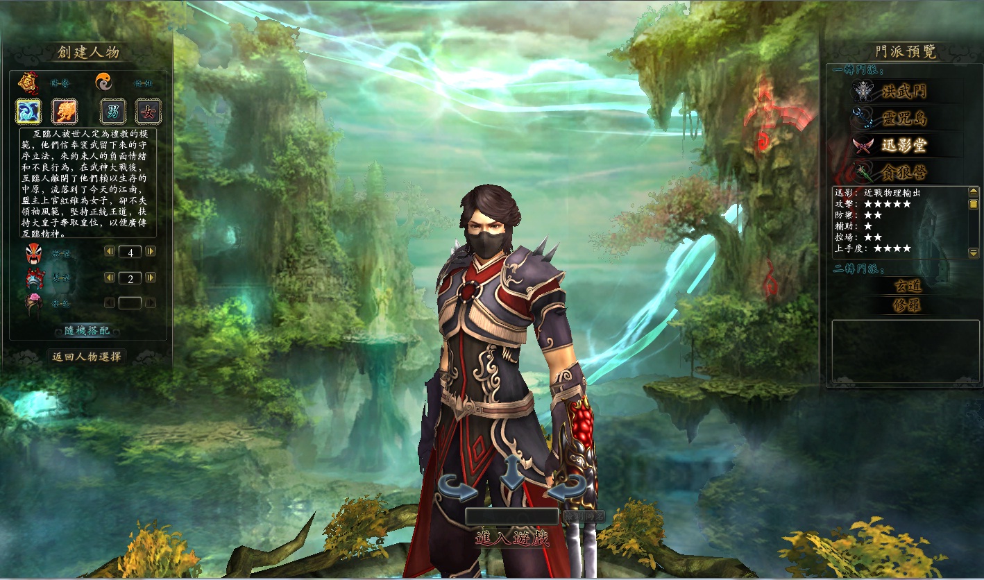 | 在創建人物畫面上,可以看到所有一轉門派的預覽,以此圖為例是迅影堂的預覽 |