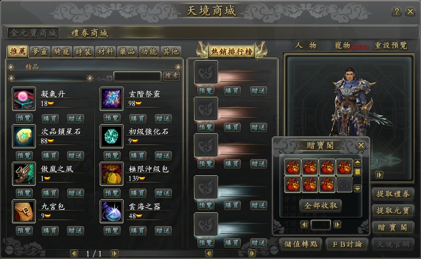 這裡也跟大家說明一下禮包的領取方法。遊戲中定時會贈送禮包,點選介面右下角的商城按鈕,就可以打開這個介面,再點選贈寶閣就可以領取禮包了。小天試著先不領取看看會送多少種禮包,結果發現居然有 7 個禮包,外加每天登入好禮贈送的禮包就有 8 個。