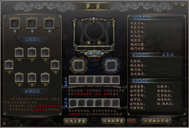 操作畫面的右下方可以打開「夢靈系統」,可以看到許多關於夢靈的技能、屬性與其他變化值、成長值,似乎夢靈在遊戲中能夠進行培養,不過在命運之境中似乎還沒有辦法取得夢靈,因此無法再詳細為大家介紹。