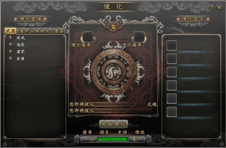 除了夢靈系統之外,還有一個系統是「煉化系統」,在煉化系統上可以看到,玩家能夠從此功能製作武器、防具、飾品、以及橙色物品(傳說等級)的裝備。