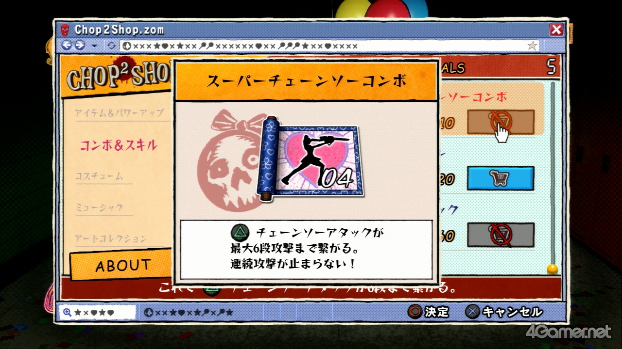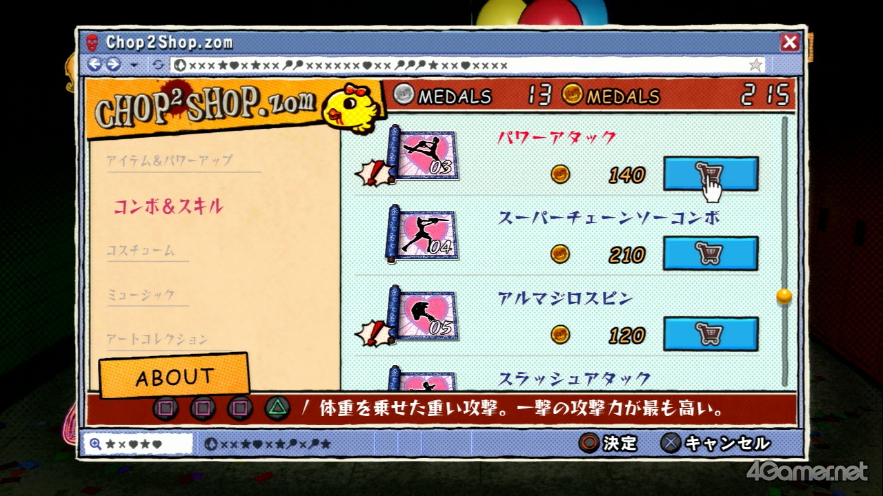 因為一開始時可以施展的連段攻擊很短,也不能使用各種技能。所以在本作中要打倒殭屍、破壞垃圾桶跟櫃子等物件來取得殭屍幣,這樣一來就可以在關卡中設置的商店(CHOP2SHOP.ZOM)那買到連段攻擊跟技能,還有讓能力上升等等的道具。