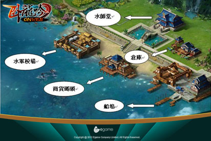 當玩家等級達到130級主城出現一個類似港口的連接點建築,點擊連接點即可進入海港。海港中出現全新的建築和場景,每個建築都有一個全新的功能,並和原主城一樣可對建築進行升級。而每個建築的功能細節囊括海戰準備,製造戰船,訓練水軍將領,研究水戰科技等等,帶給玩家全新體驗,海陸全面開戰!