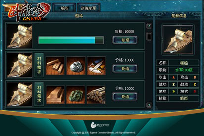 在海戰的系統中,玩家可在船塢中,製造和修理戰船。製造船舶需要收集足夠材料方可造出嚴整水師,材料更可以在水戰和成就中獲得!戰船擁有和陸戰兵種一樣的屬性,每種戰船都有各自技能。讓玩家穿越三國媲美周郎再現
