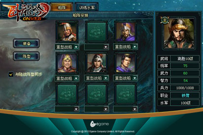 在船陣中可自由調整武將位置,不受陸地陣型限制和影響,但陸路上威猛無比不等於能夠稱霸水軍喔,想要龍騰怒海就要看玩家水軍等級和戰船