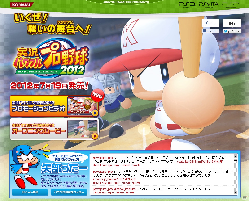 實況野球 2012(実況パワフルプロ野球2012)》,在官方網站公開了本作遊玩模式的介紹影片。影片中除了公開成功模式〈サクセス〉、季賽模式〈ペナント〉、人生模式〈マイライフ〉的新要素之外,也收錄 PS3 版跟 PS Vita 版線上專用網路模式「威力球場(パワスタ)」。