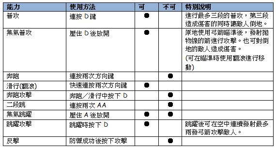 精靈射手 - 托恩斯是遠距離攻擊型英雄,近戰時可利用三段普攻來攻擊敵人,使敵人倒地後,再利用集氣發射弓箭追加攻擊,對敵人造成多重傷害。遠距離則利用集氣瞄準連續發射弓箭來達到攻擊最大化。
