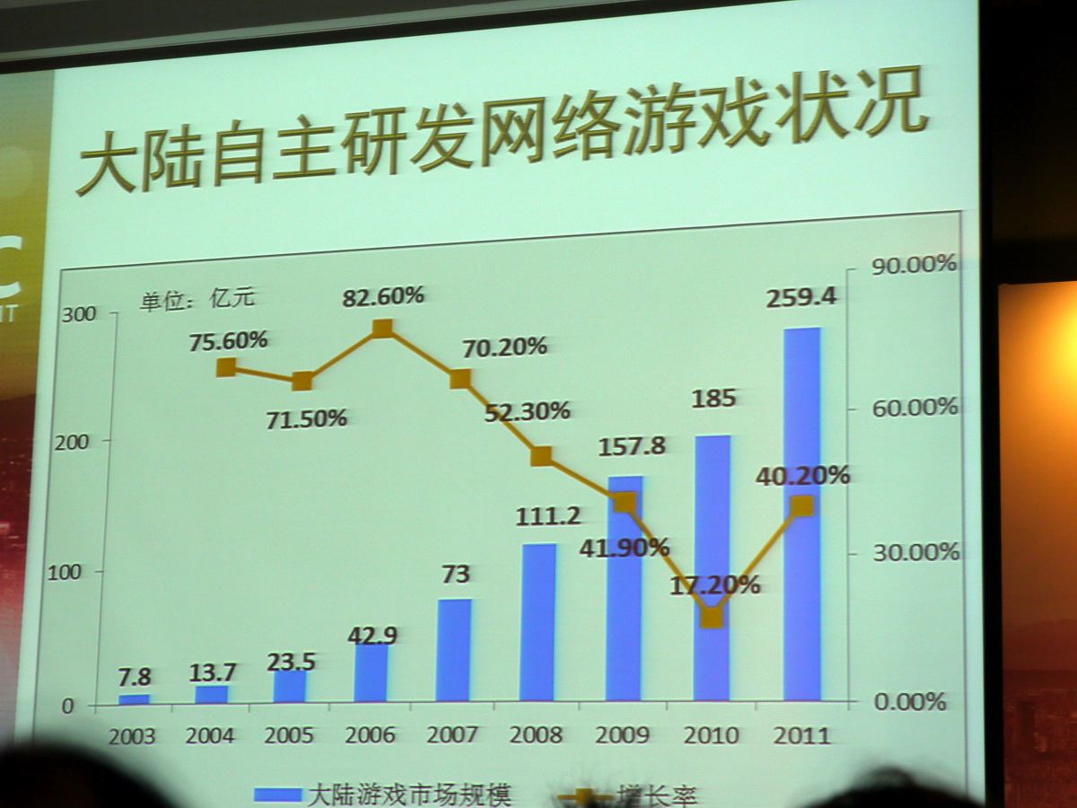 中國大陸文化部文化市場司副巡視員傅燕梅表示,中國大陸遊戲產業至今保持快速成長,線上遊戲產值已經達 428 億元人民幣、成長 33%,行動遊戲產值達 38 .7 億元、成長 51.2%;以用戶量來說,線上遊戲達 1.6 億人、成長 33%,網頁遊戲用戶達 1.45 億人、成長 24%,行動遊戲用戶達 5 千 1 百萬人,達 36%。整個網路遊戲市場比例,線上遊戲佔 91.09%,而行動遊戲則佔 8.91%。