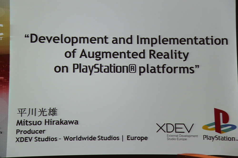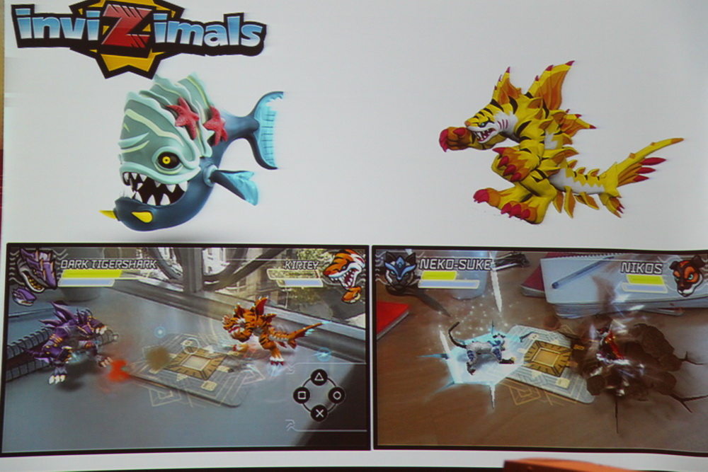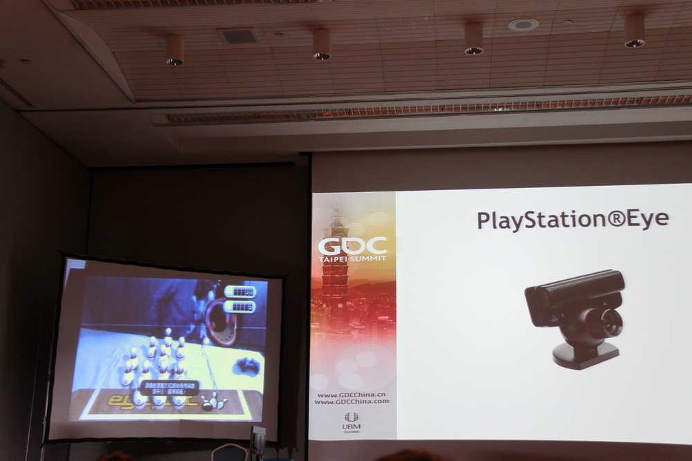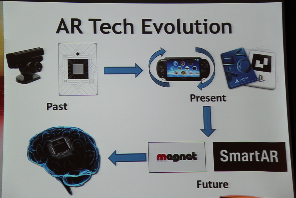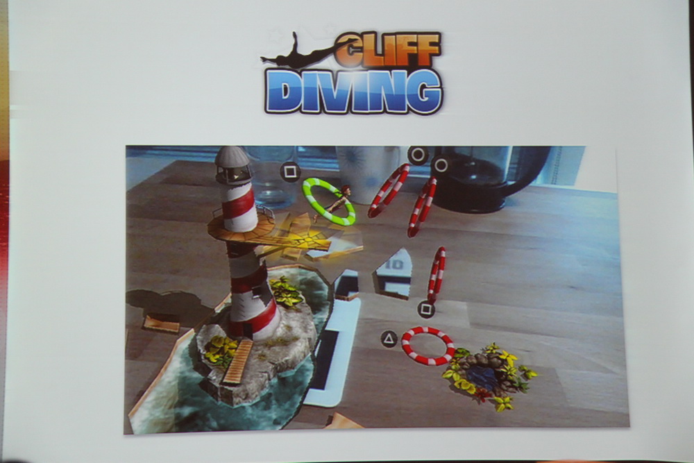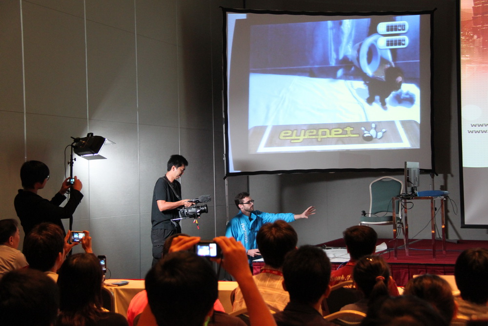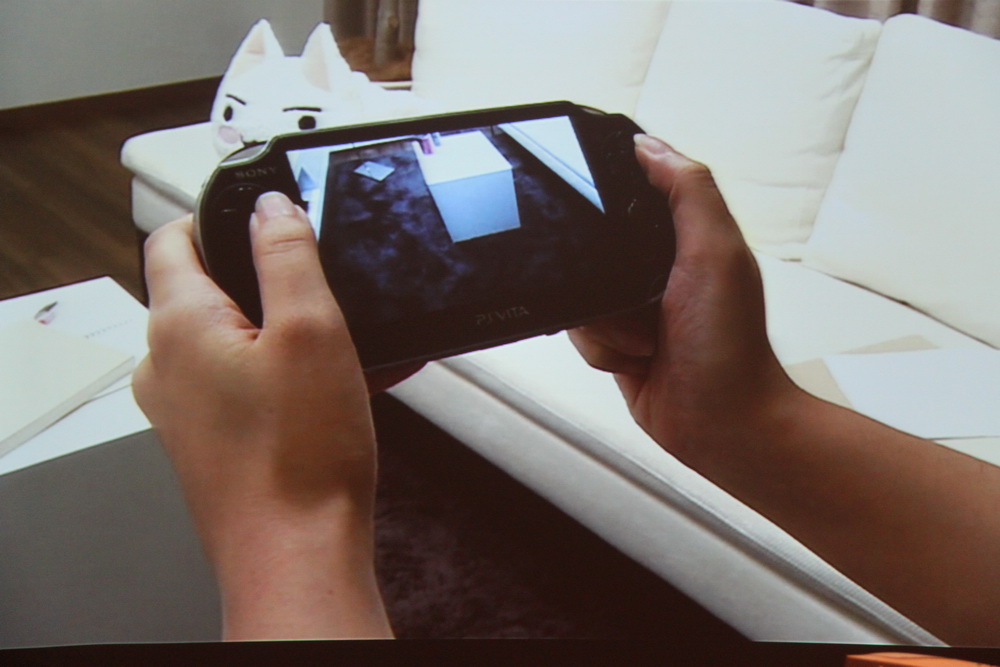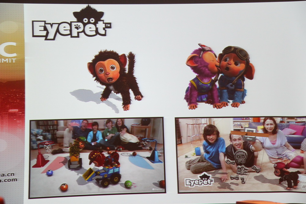 平川光雄接著提到了目前 SONY 在各種遊戲平台上,如何運用 AR 技術來帶給玩家嶄新的體驗。首先展示了過去的成果,於 2000 年推出的視訊攝影機「PlayStation Eye」。並且實際展示了運用 PlayStation Eye 的遊戲《EyePet》,現場也透過 PS Eye 結合現實環境與虛擬角色,展示玩家輕鬆無負擔的飼養虛擬寵物玩法。