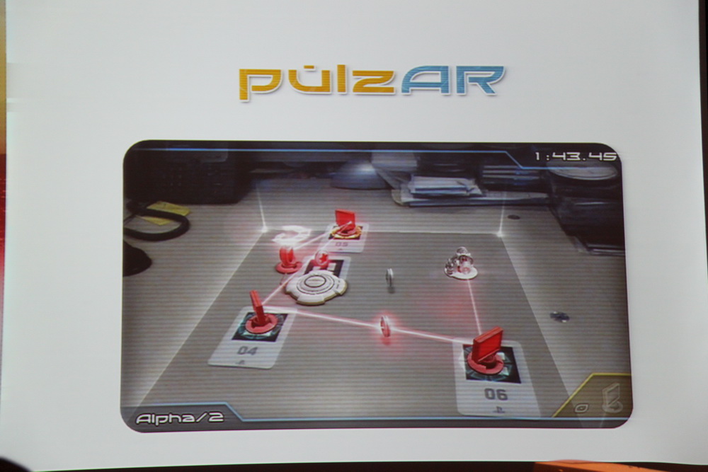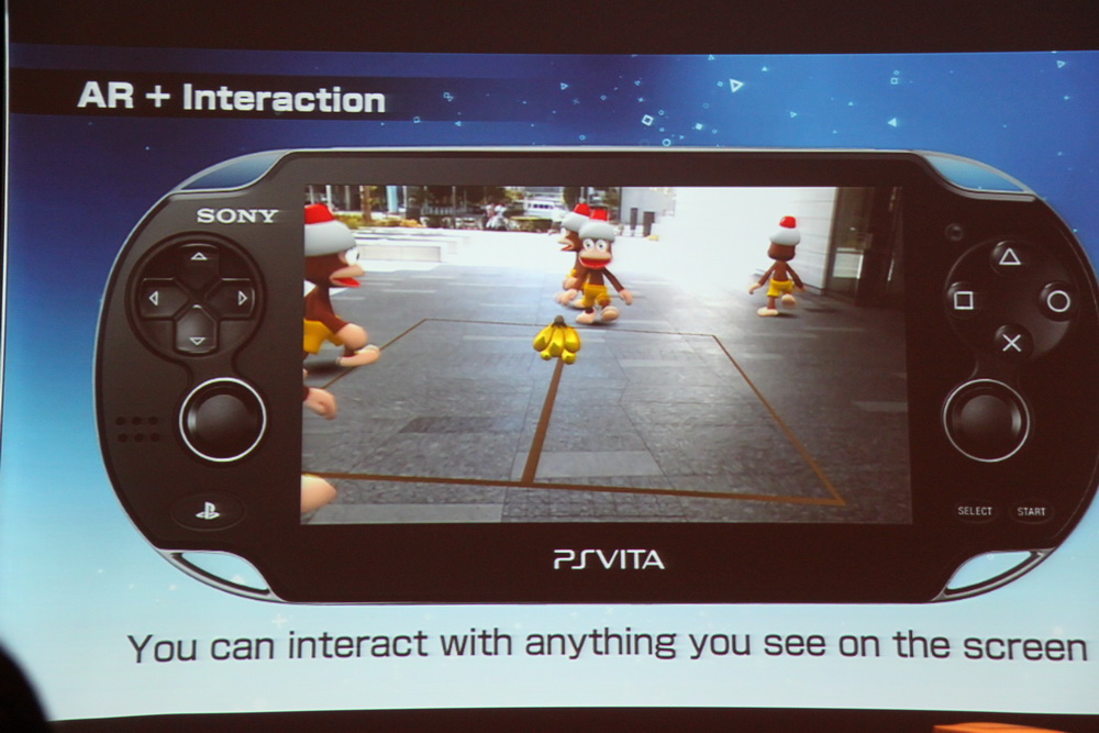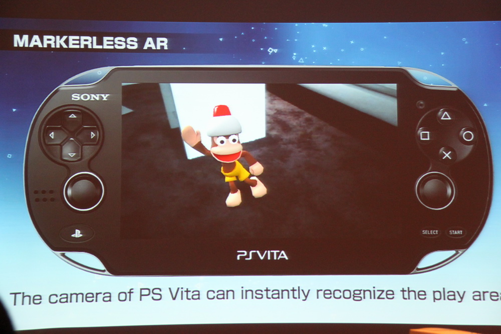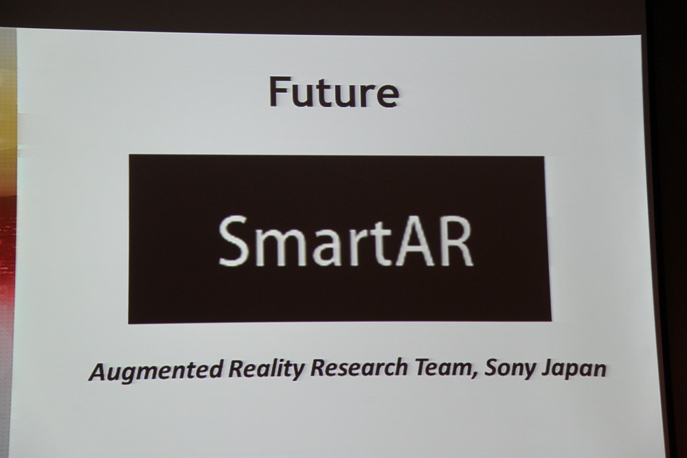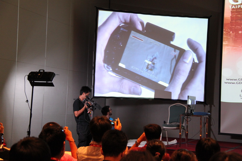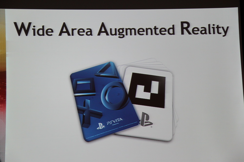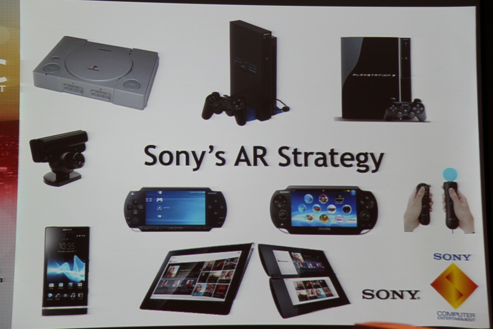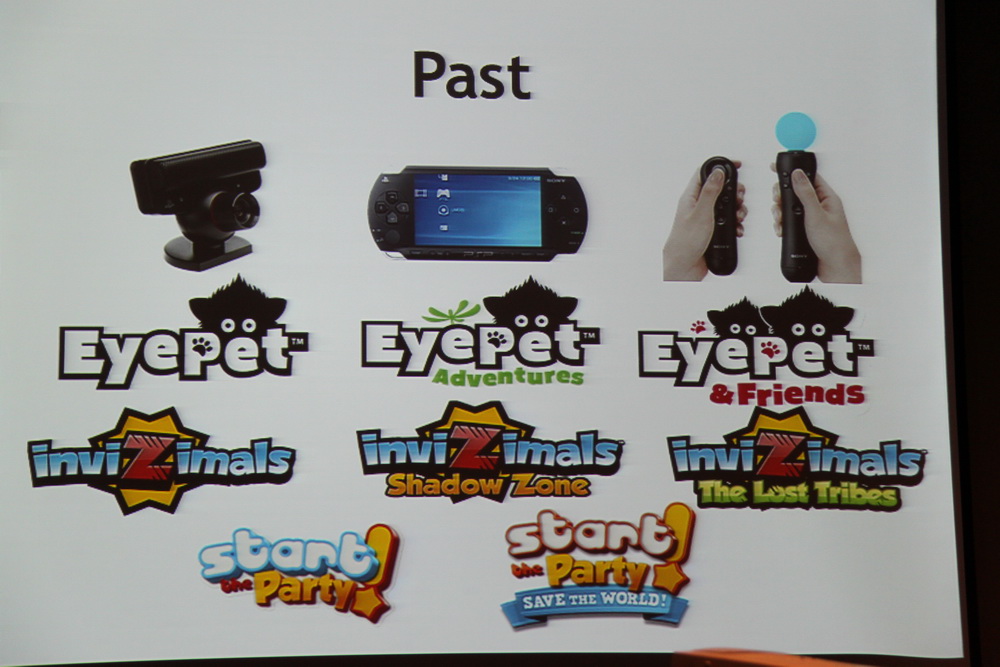 平川光雄接著提到了目前 SONY 在各種遊戲平台上,如何運用 AR 技術來帶給玩家嶄新的體驗。首先展示了過去的成果,於 2000 年推出的視訊攝影機「PlayStation Eye」。並且實際展示了運用 PlayStation Eye 的遊戲《EyePet》,現場也透過 PS Eye 結合現實環境與虛擬角色,展示玩家輕鬆無負擔的飼養虛擬寵物玩法。