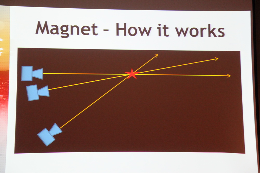 磁石技術原理,是利用從多個角度來拍攝定點的物體,來建構出立體模型的樣貌,進而確立虛擬物件的定位點。並且可以在自家的庭院,使用 AR 來和庭院中實際場景結合,也可以和虛擬物件作遊戲上的互動操作。