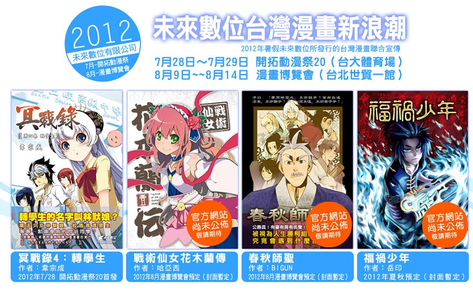 未來數位有限公司預定將於今年夏季開始陸續推出《冥戰錄》第四卷 ~轉學生~《戰術仙女花木蘭傳》、《春秋師聖》以及《福禍少年》、《聊齋夜話 ~狐媚~》、《硝化蘋果甘油 APPLE DYNAMITE》等作,以下為官方所提供之相關資訊。