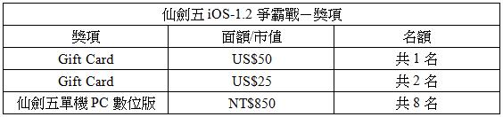 誰最猛?仙劍五iOS-1.2爭霸戰將於6/29~7/16期間展開廝殺!7/18公布比賽結果,成績以Game Center成績排名為標準,分數排名前3名,可獲得APP Store的Gift Card,第4-11名可獲得仙劍五單機PC數位版。仙五iOS獎項詳見下方表格: