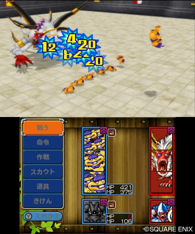 另外還有一個很容易發現的變更點是,本作將在原創版本裡把怪獸變成伙們的系統,變更成為「挖角系統(スカウトシステム)」了。在 Joker 系列中採用的系統是在戰鬥中,使用技能「挖角攻擊(スカウトアタック)」給予敵方攻擊,依照給予的傷害量挖角成功率就會上升的系統。而未曾玩過 Joker 系列的玩家可能會覺得有點違和感,但使用「魔物的餌食(魔物のエサ)」「燻製肉(くんせいにく)」「霜降肉(しもふりにく)」等肉類道具,怪獸也會較容易成為伙伴的要素也同時繼承使用。打倒敵方怪獸時,怪獸有很低的可能性會成為伙伴的設計也殘留下來。同時採取新舊系統的優點使用。