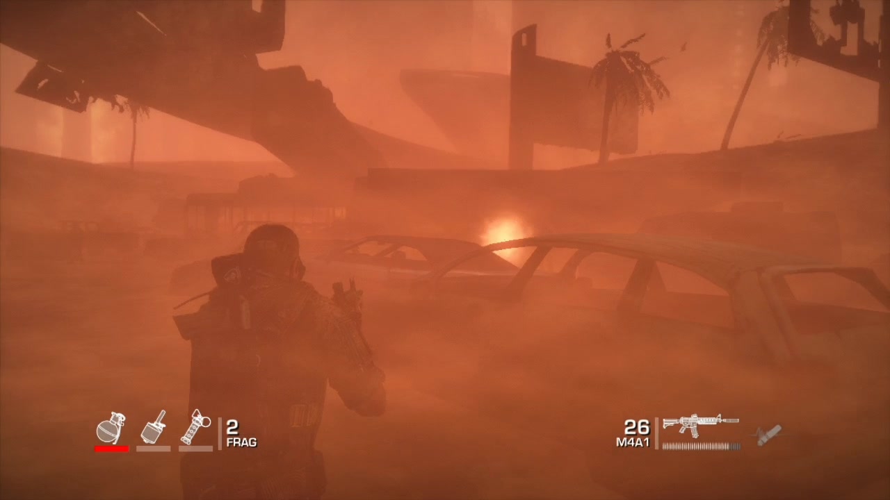 另外,遊戲中還會不定時的吹起巨大的沙塵暴,此時不僅玩家的視線會嚴重受到干擾、雷達失效,連開槍都會受到影響,而這個特色也出現在多人遊戲中,在進行線上對戰時,玩家千萬要注意附近是不是有地方正在「漏沙」,如果有,請趕快離開那裏以策安全,而在吹起沙塵暴時,也要更小心對方玩家的偷襲。