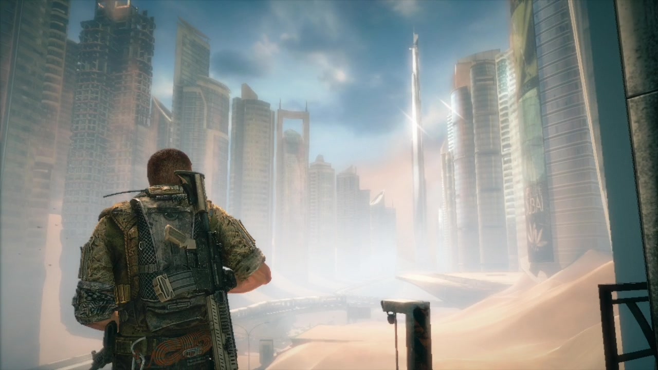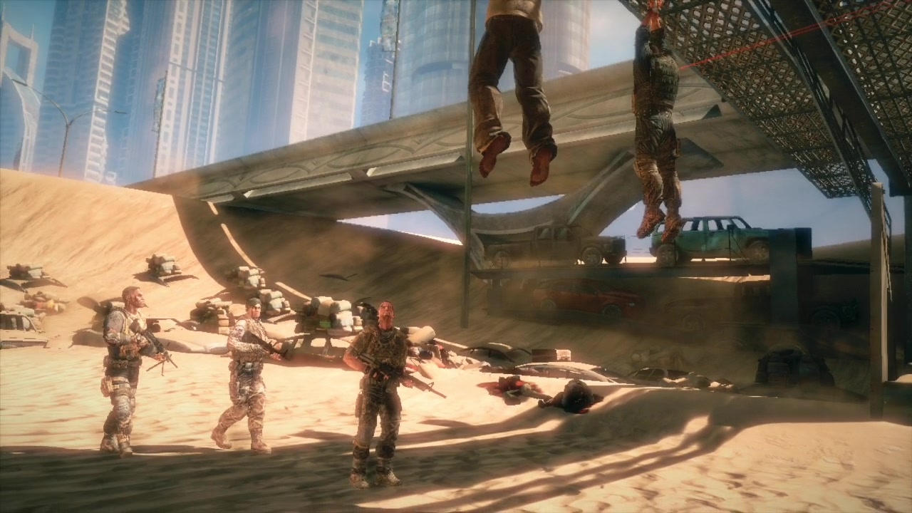 本作既是以沙漠為舞台,那麼當然「沙塵」的表現是一大重點,《特種戰線》以 Unreal 3 引擎打造而成,除了重現杜拜當地建築物內原本的華麗內裝之外,在充斥整個城市的「沙」上的光影與物理特效的表現上也是一流,別以為在遊戲中沙子只是像煙霧一樣擋視線的玩意,其實各種與沙子的互動,正是《特種戰線》的重頭戲,除了能利用爆炸揚起沙塵阻礙敵人視線之外,玩家還能利用破壞周邊的環境引起沙塵崩落,輕則暫時癱瘓敵人的行動,若是引起巨大的「沙崩」,甚至還能一舉淹沒一大票的敵人。