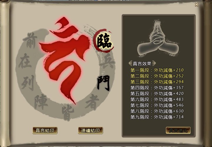 另外,此次改版也將推出全新系統─「九字真言」,玩家可以透過結印方式,發動各真言的特殊效果。使用對應的手印密章後,在天盤介面裡對應的真言就會浮現,玩家將擁有真言的強大效果,並持續強化,將九字真言發揮得淋漓盡致,以對抗侵擾天界的惡勢力。