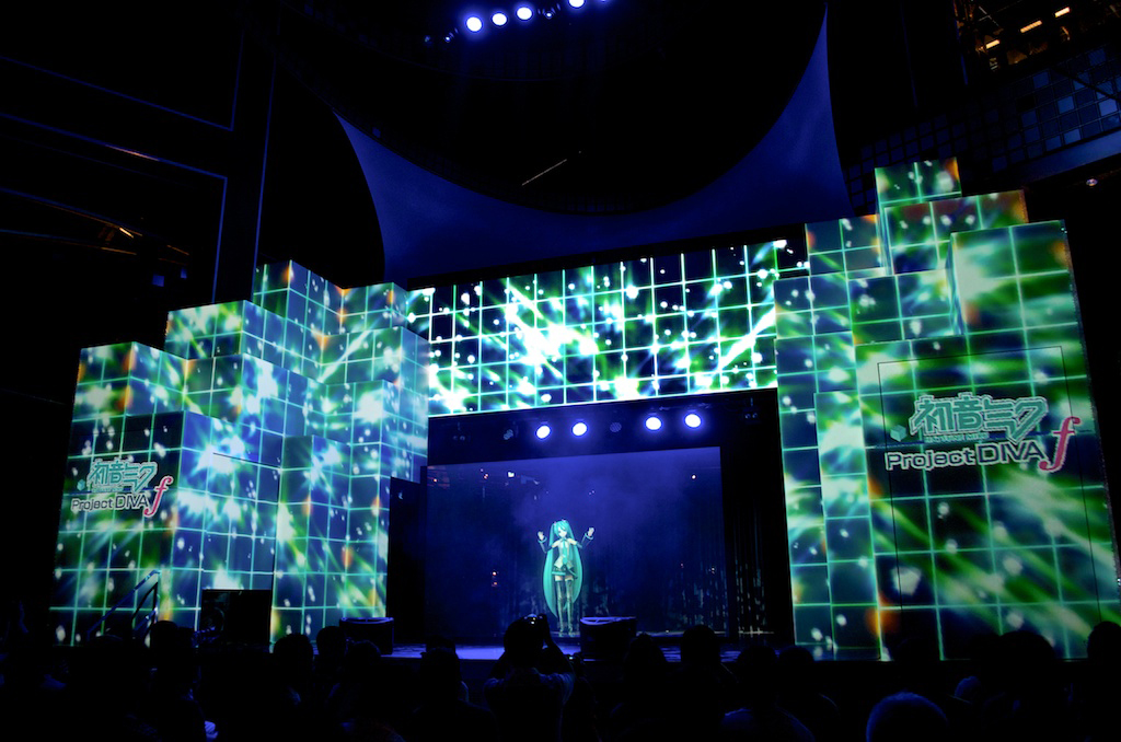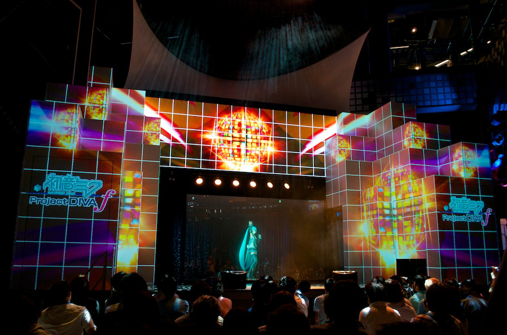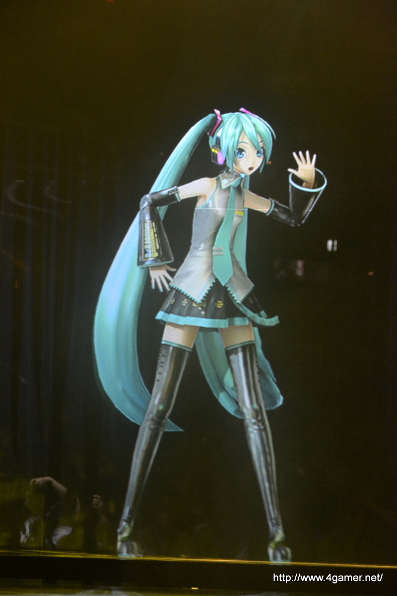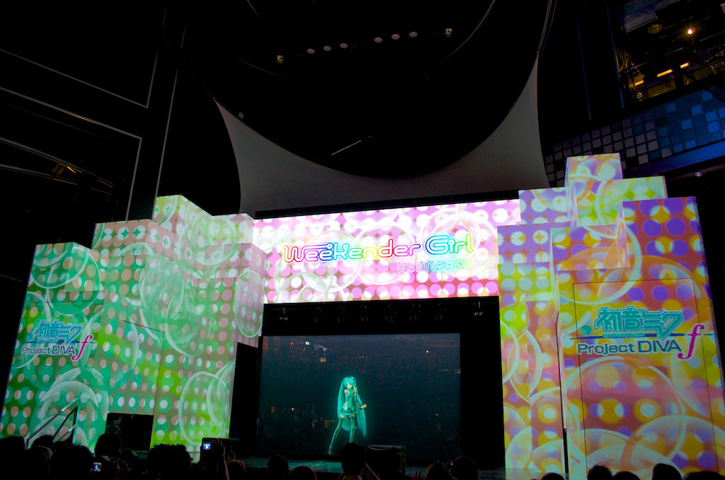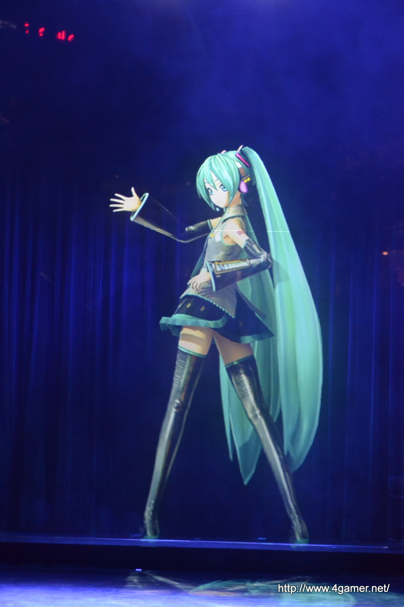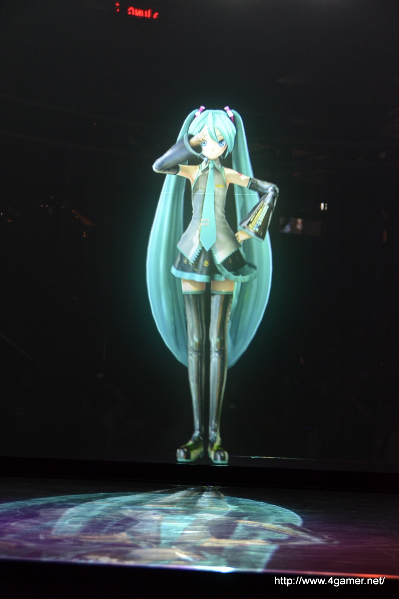 而舞台的重點初音未來,則是登場在「初音未來感謝祭演唱會(ミクの日感謝祭)」等活動中令人熟悉的 3D 投影透明螢幕裡。記著者表會上雖然是讓大家坐著觀賞,但是實驗的演唱會是站著觀賞的形式。而且因為舞台和台下的距離非常的近,所以更可以近距離的享受充滿臨場感的初音未來表演。
