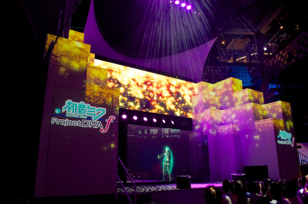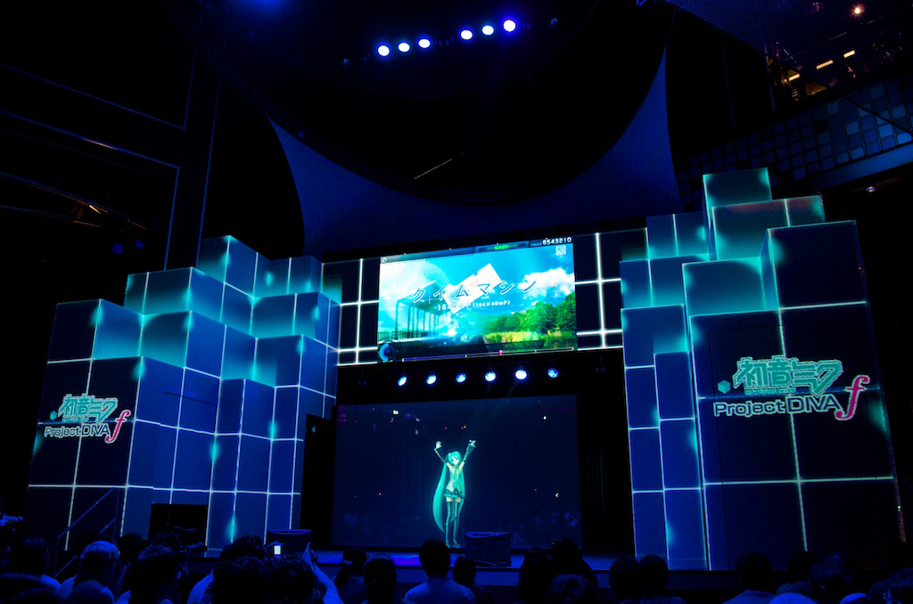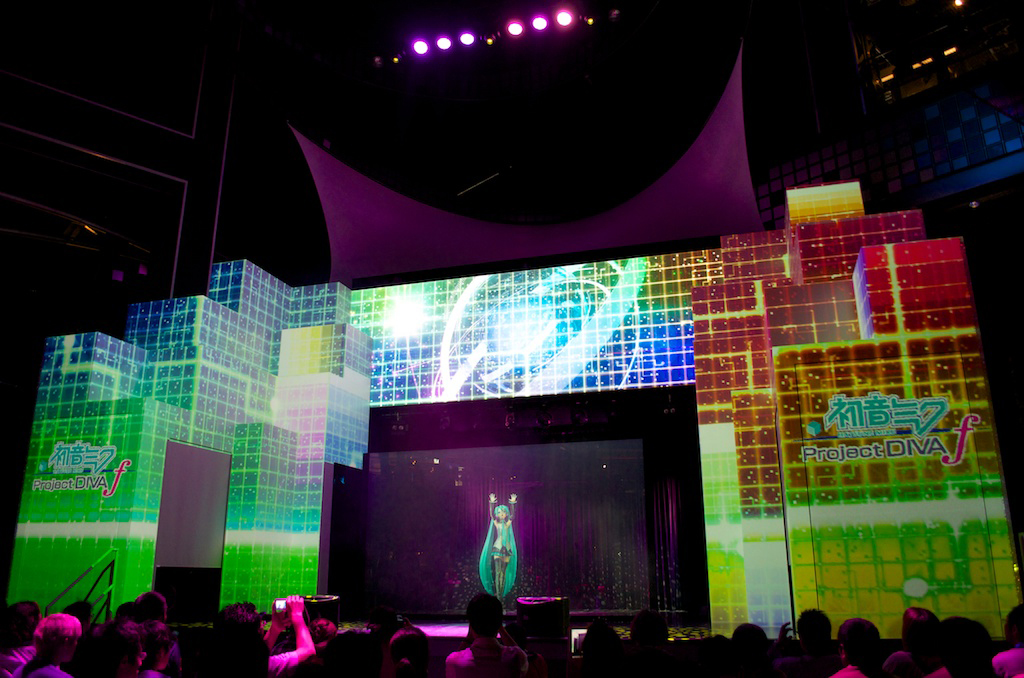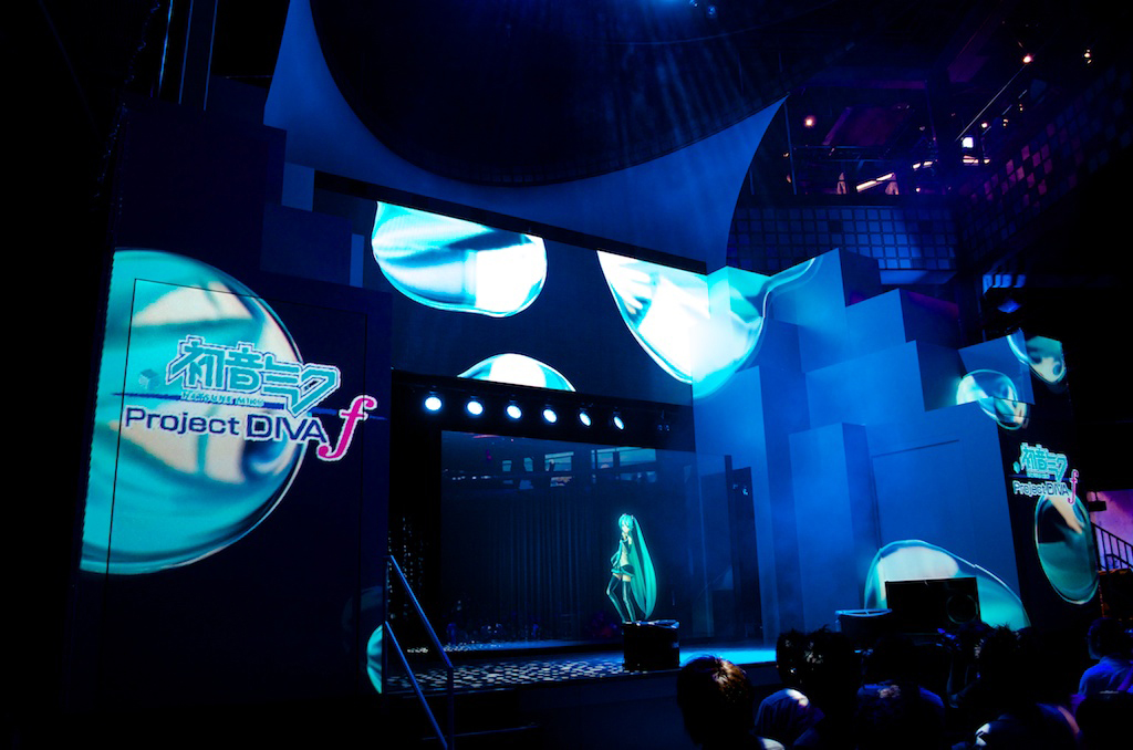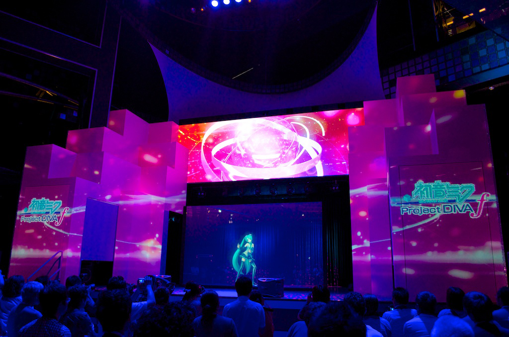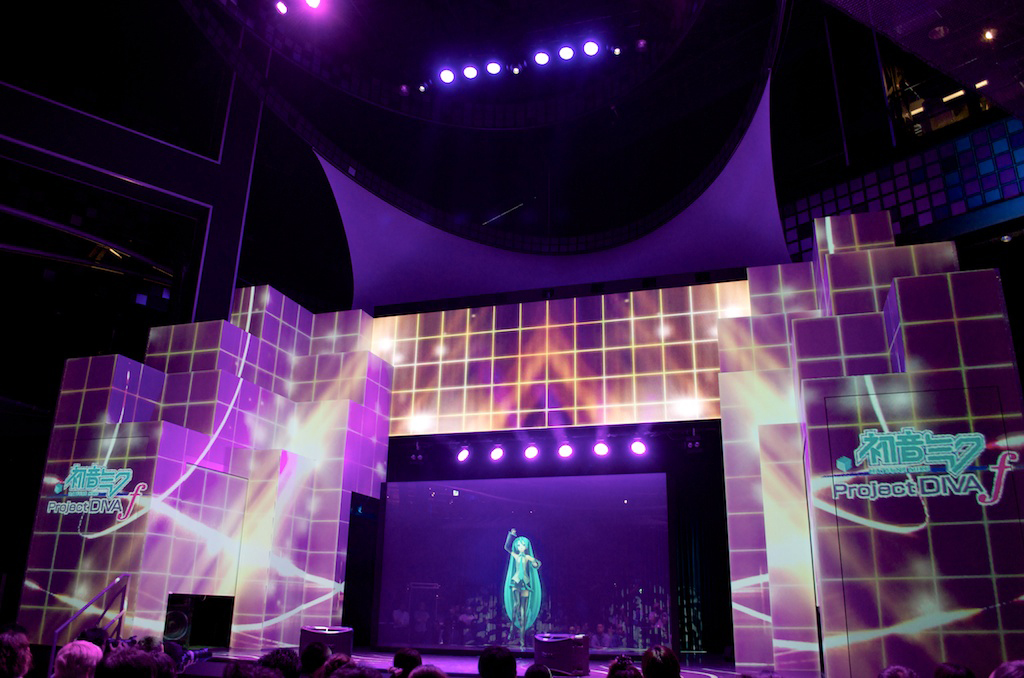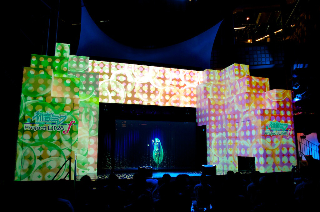 而舞台的重點初音未來,則是登場在「初音未來感謝祭演唱會(ミクの日感謝祭)」等活動中令人熟悉的 3D 投影透明螢幕裡。記著者表會上雖然是讓大家坐著觀賞,但是實驗的演唱會是站著觀賞的形式。而且因為舞台和台下的距離非常的近,所以更可以近距離的享受充滿臨場感的初音未來表演。