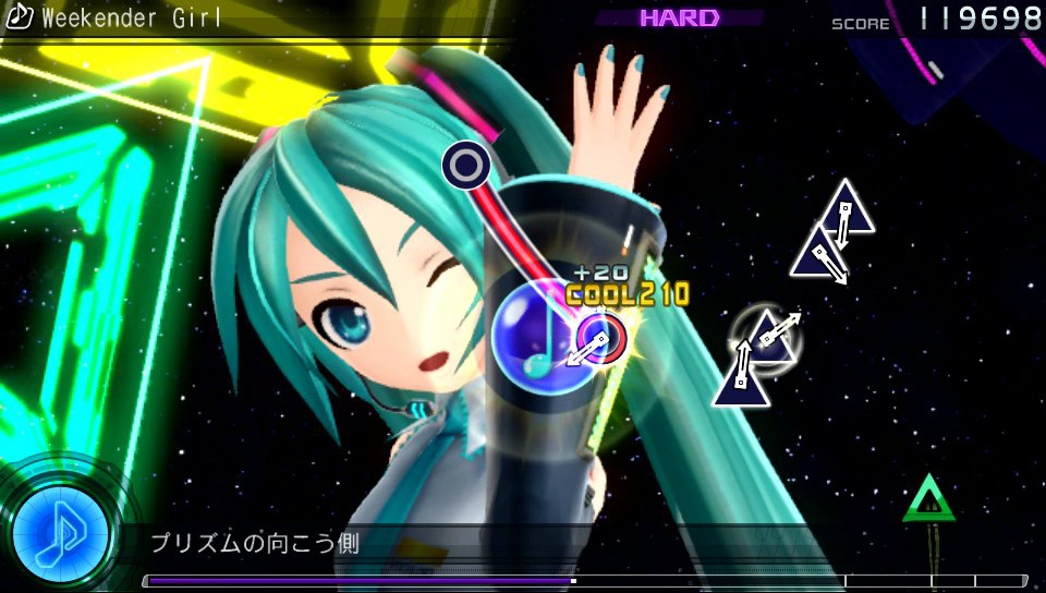 初音未來 -名伶計畫- f》中的收錄曲目。而且「Weekender Girl」和「ODDS&ENDS」也可以趁此機會在東京 JOYPOLIS 三樓的 PSV 試玩區中展出的展示機上實際的試玩。