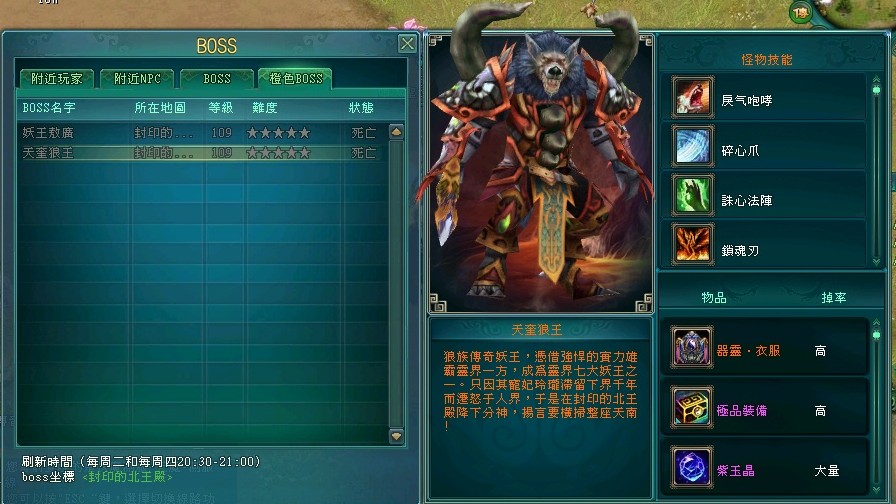 「天奎狼王」乃靈界七妖王之一,鎮守「封印的北王殿」,其實力強悍,以力量壓迫天車眾生!主力技能 --「狼族盛宴」可對對手造成 100% 爆擊及額外提高 100% 傷害,堪稱秒殺任何目標!此外,「天奎狼王」更會發動「誅心法陣」,定身結界內所有目標,並使目標每 10 秒流失 2 萬生命!