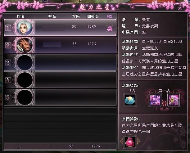而另一個新活動「魅力之星」會全面將“仙藤花”活化!每周的“魅力之星”除了可以獲得屬有稱號外,更可使全宗門成員也獲得獎品喔!