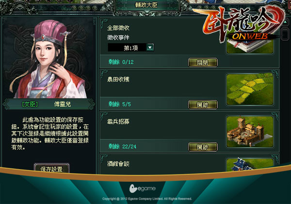 各位主公,是否在為邊關戰事煩惱而無暇顧及繁雜的內政?在外征戰卻還心憂都城,唯恐敵軍突襲後方?此次改版后《臥龍吟》的主城中出現了一個曼妙的身影,此人喚作傅靈兒,專門應徵來為各位主公打理繁雜的政事,有此絕色佳人擔當輔政大臣,各位主公還有什麽可擔憂的?
