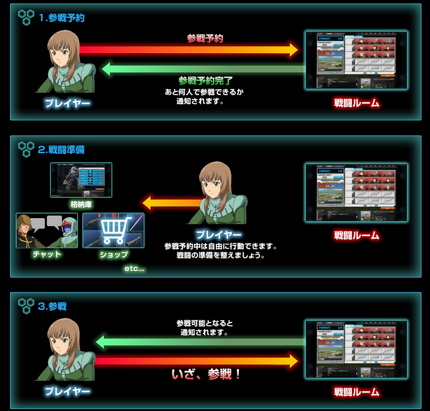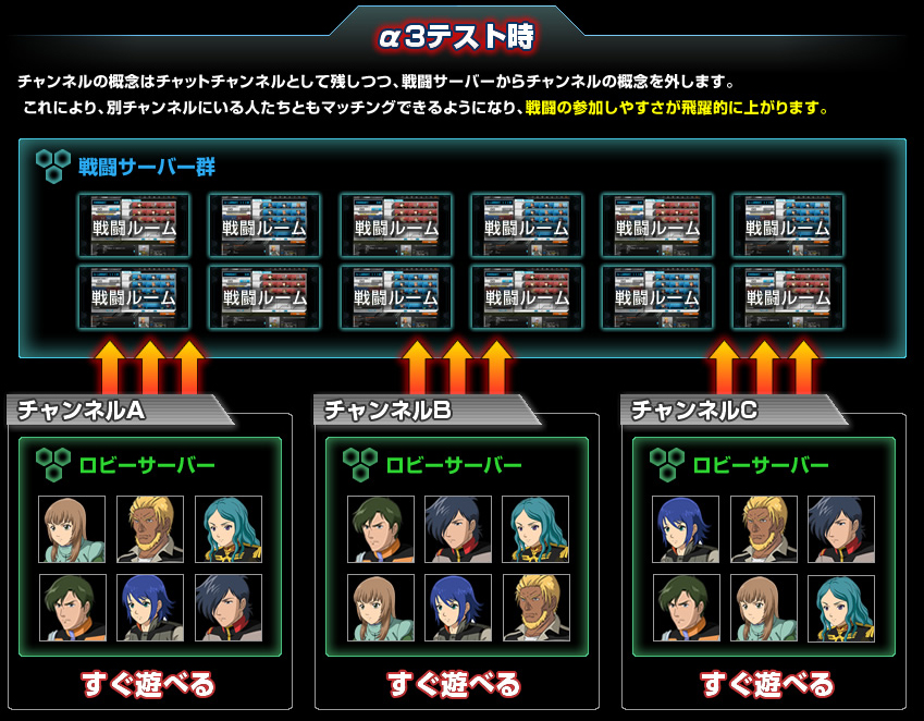 目前為止不同頻道的玩家是不能加入同一個戰鬥房的,不過因為這次的變更不管是哪個頻道的玩家都能配對了。因此到戰鬥開始為止的等待時間大大的縮短了。另外,這次追加的「參戰預約」系統,讓玩家可以設定戰鬥開始前的等待時間,也可以聊天跟去商店買東西了。