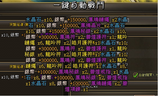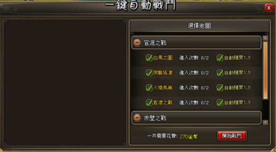 只要第一次成功通關,遊戲系統便自動記錄我們的通關數據,在日後每天便能享受到『一鍵戰鬥』的快速便捷服務。更讓人興奮的是,我們在一鍵戰鬥的介面還能自由選擇是否購買一次通關次數,或者是選擇通關的地圖,待選擇完之後只需點擊『開始戰鬥』按鈕,滿目琳琅的寶物盡入囊中。