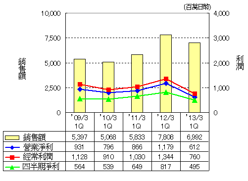 期限內所累積之第 1 四半期合併業績銷售額為 69 億 9 千 2 百萬日幣(與前年同期相比減少10.5%),營業淨利為 6 億 1 千 2 百萬日幣(相對減少 48.1%),經常利潤為 7 億 6 千萬日幣(相對減少43.4%),四半期淨利為 4 億 9 千 5 百萬日幣(相對減少 39.4%)。