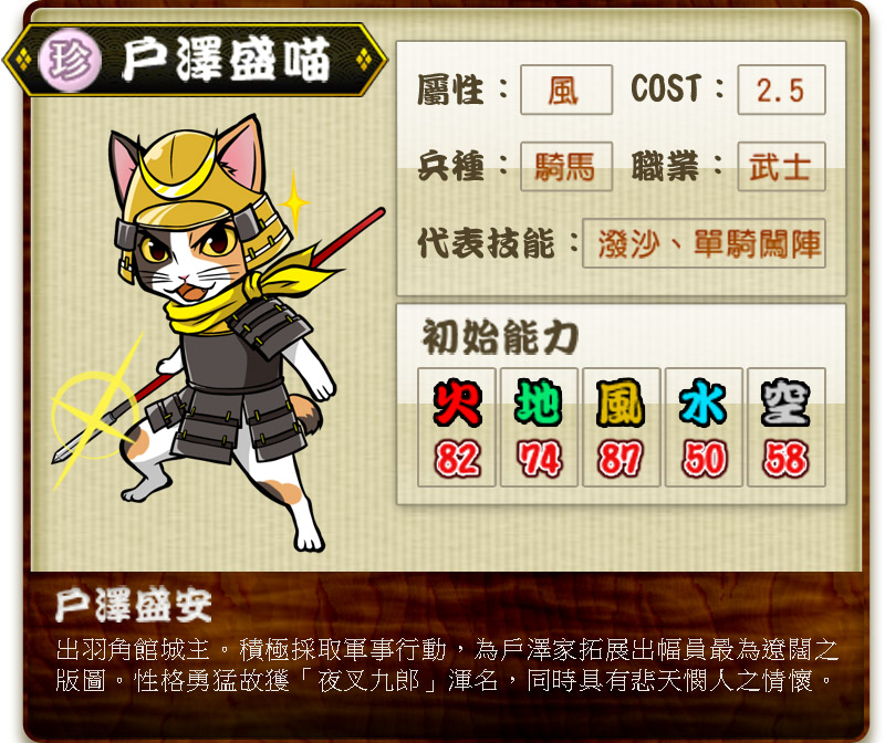 風屬性的「戶澤盛喵」是出羽角館城主,積極採取軍事行動,為戶澤家拓展出幅員最為遼闊之版圖,性格勇猛故有「夜叉九郎」之稱!遊戲中其獨特技能「潑沙」攻擊敵方一人後,被攻擊的敵人將難以命中我方!