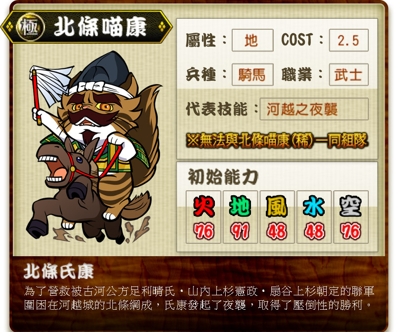 本次改版推出貓武將極卡之一「北條喵康」為日本戰國時代著名武將,以傑出的軍事及政治才能聞名,與「越後之龍」、「甲斐之虎」齊名,被稱為「相模之獅」!為營救被山內上杉憲政、扇谷上杉朝定的聯軍圍困在河越城的北條綱成,氏康發起動夜襲,取得壓倒性的勝利!遊戲中其獨特技能「河越之夜襲」將可攻擊周圍的敵人,並降低敵人的攻擊力及防禦力!