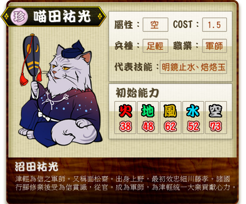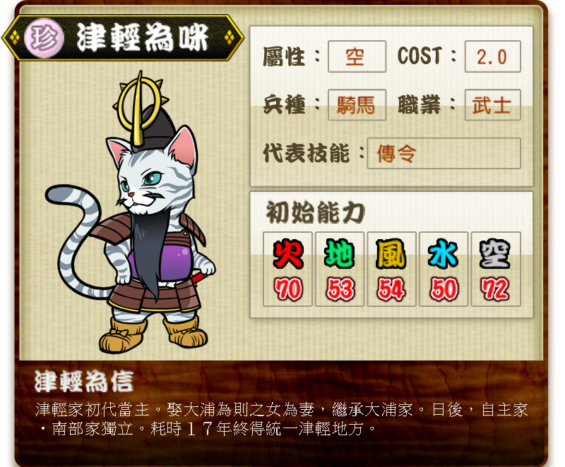 空屬性的「津輕為咪」為江戶時代早期的大名,耗時17年終得統一津輕地方,因留著長長的鬍鬚被稱為「津輕的美髯公」!遊戲中其獨特技能「傳令」將可解除周圍我方將領的混亂、籠絡狀態!