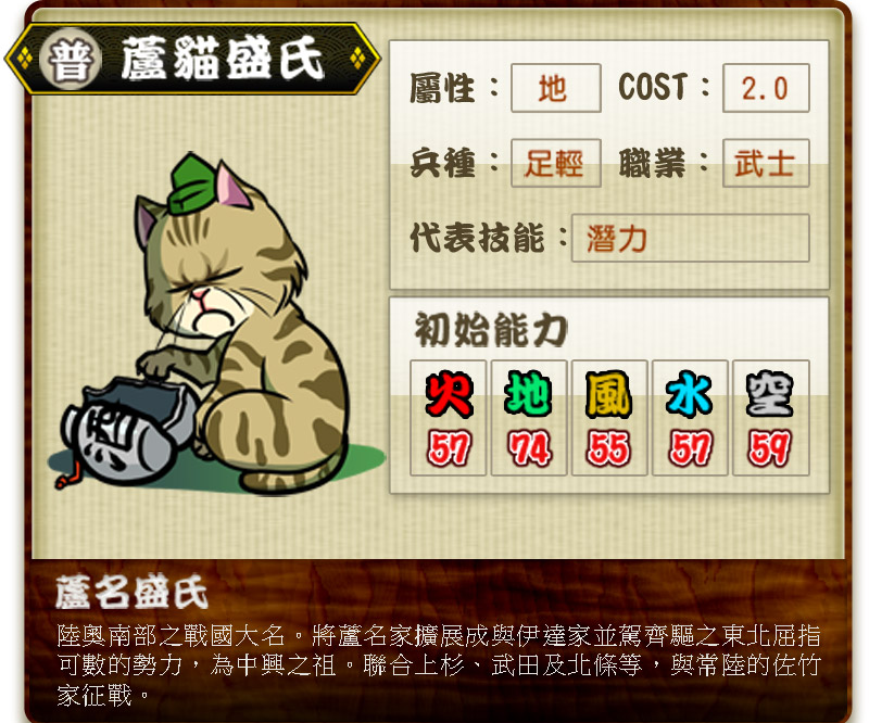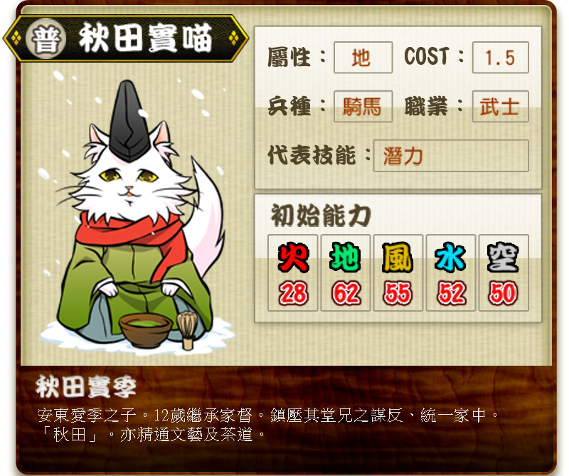 地屬性的「秋田實喵」12 歲繼承家督,鎮壓其堂兄之謀反,獲秀吉賜秋田郡後改姓「秋田」。亦精通文藝及茶道!