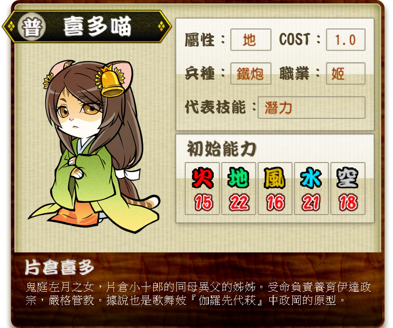 本次改版唯一一位喵姬「喜多喵」為片倉小十郎的同母異父的姊姊,受命負責養育伊達政宗,管教非常嚴格!遊戲中擁有「潛力」技能當兵力越少時,防禦力越會提高。