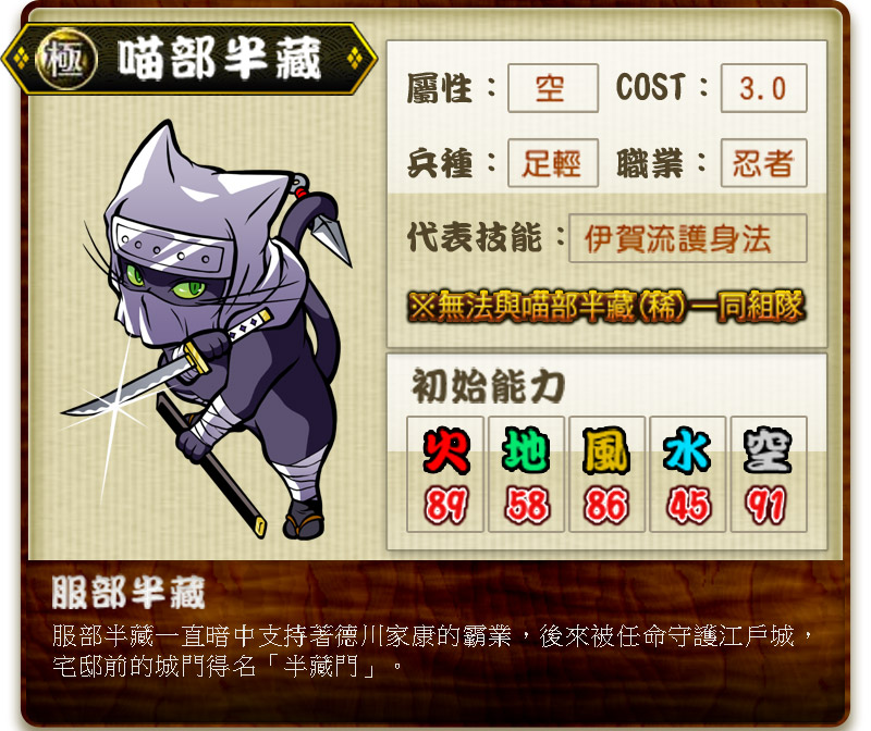 本次改版另一張貓武將極卡「喵部半藏」為日本戰國時代至江戶時代初期時德川氏麾下的武士一族,暗中支持著德川家康的霸業,後來被任命守護江戶城,宅邸前的城門得名「半藏門」!遊戲中其獨特技能「伊賀流護身法」當身為總大將時,我方全體的能力將提升!