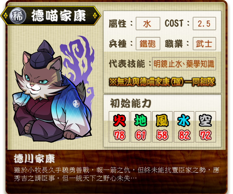 本次改版推出唯一貓武將稀卡「德喵家康」,為日本戰國時代的大名,戰國時代統一全日本,史稱「江戶時代」!遊戲中其獨特技能「明鏡止水」將會提升「德」,並使敵人難以造成混亂、或進行籠絡!
