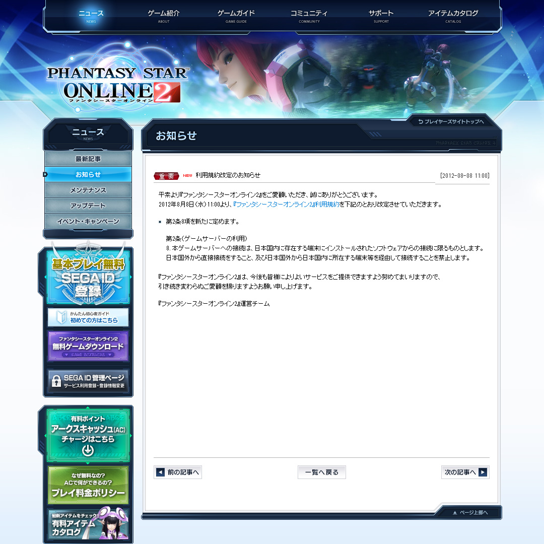 》,宣布將自 8 月 8 日 11:00(日本時間)起變更使用條款,未來伺服器將只接受日本國內的連線,禁止來自日本國外的直接連線或是透過日本國內跳板的連線。
